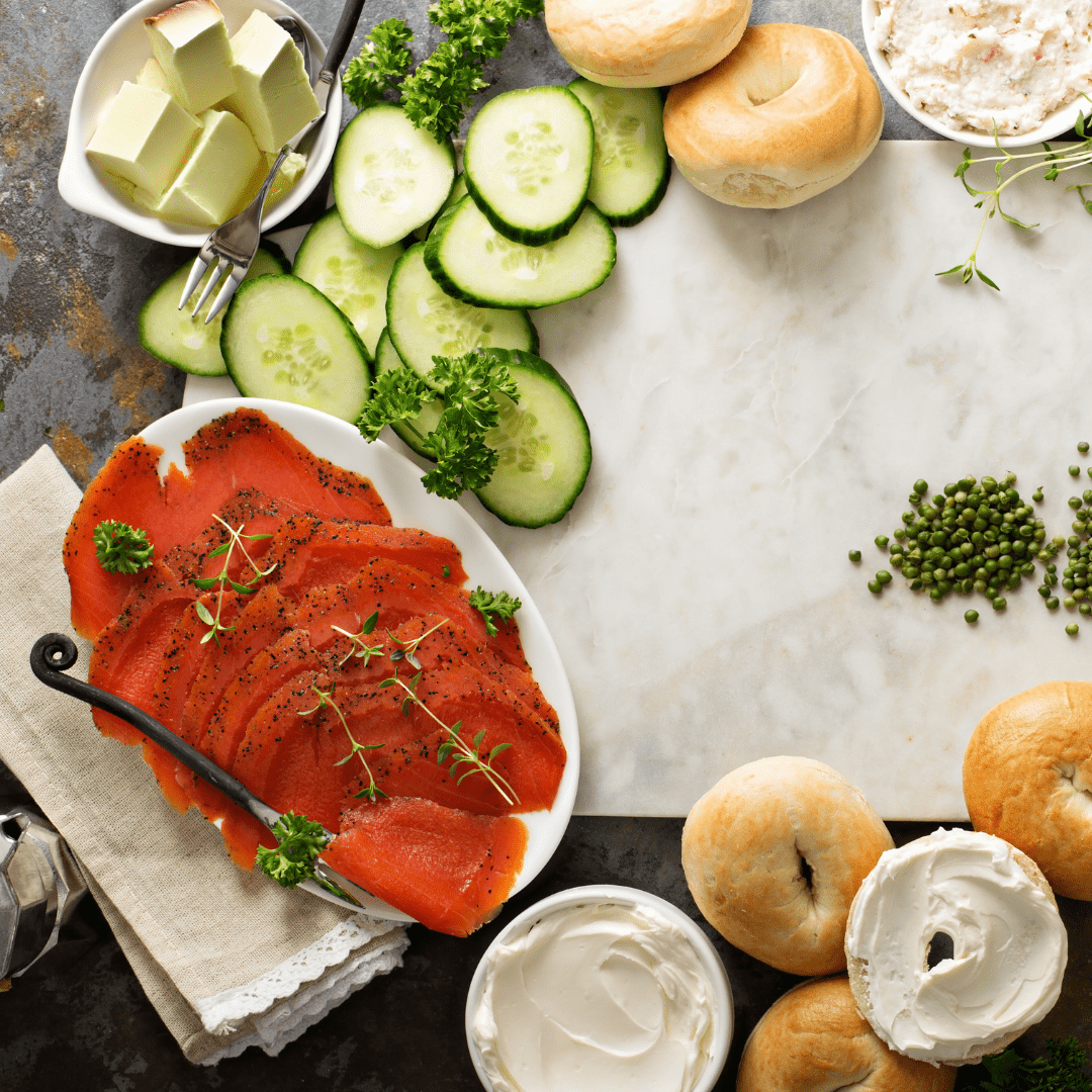 With cucumber salad, capers, tomatoes with freshly baked bagels with cream cheese and butter. (MWN)